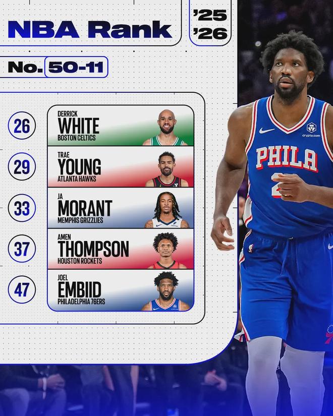 有趣的是,在ESPN的百大球员榜单中,恩比德的名字只出现在第47位,就连贾莱特阿伦(45)、兰德尔(42)、阿奴诺比(41)、祖巴茨(36)等人都比他高,说明媒体非常不看好恩比德的复出表现。
