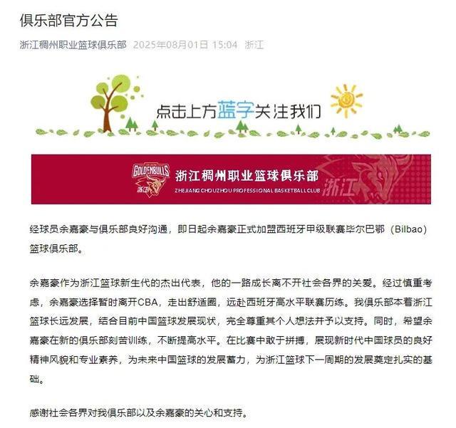 今年8月1日,浙江稠州男篮俱乐部官宣,即日起余嘉豪正式加盟西班牙甲级联赛毕尔巴鄂(Bilbao)篮球俱乐部。5月中旬他曾前往两家西甲俱乐部、六家西乙俱乐部试训。
